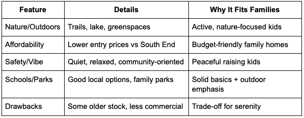 Pros: Scenic trails, greenspaces, lake access for fishing/kayaking, family parks, and a quieter suburban feel. Homes are more affordable than South End—great value for younger families or those wanting bigger yards. It's safe, with low crime and community focus. Close enough to everything (minutes to downtown or other areas) but feels secluded.