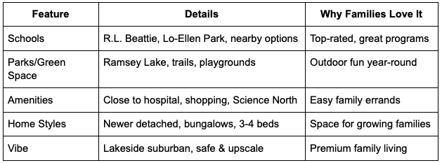 Top schools like R.L. Beattie Public and Lo-Ellen Park Secondary are highly regarded, with strong ratings for academics and programs. Proximity to Health Sciences North means quick healthcare access, which is huge for parents with young kids. Parks and trails abound: Ramsey Lake is right there for swimming, boating, or walks; nearby conservation areas and playgrounds keep the little ones active.