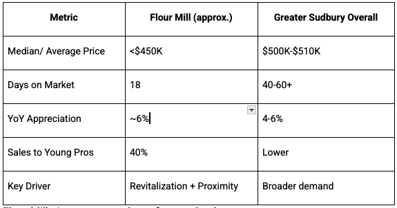While Greater Sudbury's average sale price hovers around $500K-$510K in recent months (with some reports showing $507K-$535K ranges through 2025), Flour Mill stays lower.